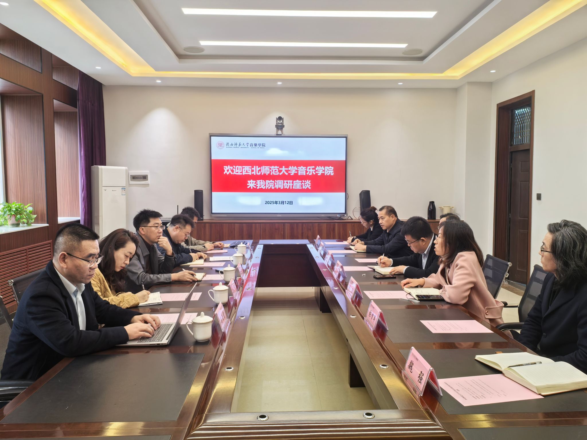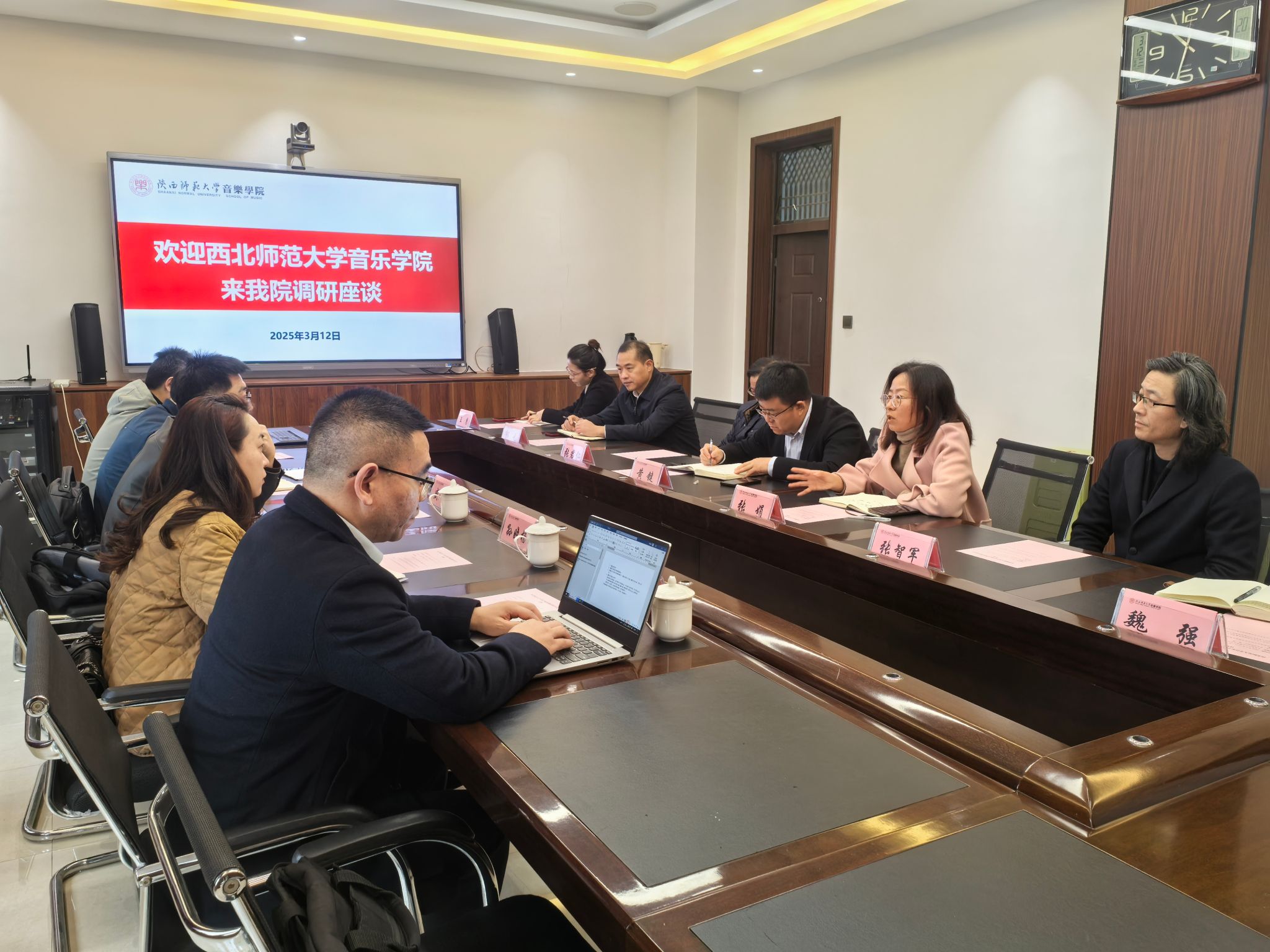 黄键代表学院对盛鸿斌一行来访表示欢迎,盛鸿斌说明了来院调研交流目的。张娟详细介绍了学院音乐学师范认证和人才培养等情况,王慧介绍了新葡萄官网举办丝绸之路乐舞文化国际学术研讨会会务工作等情况。双方围绕师范认证培养方案、课程设置、教育实习、演出证办理等方面展开深入的交流讨论。