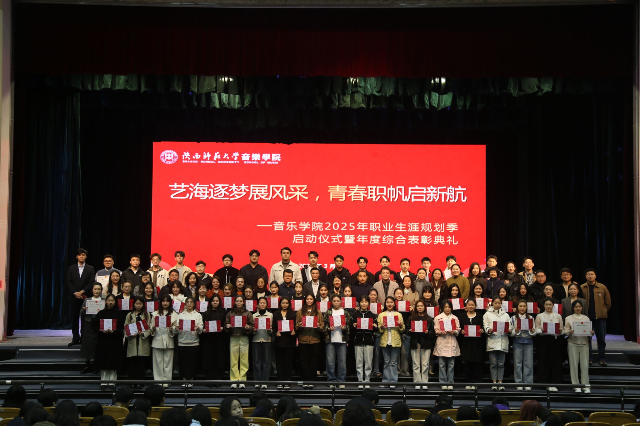 3月16日晚,新葡萄官网“艺海逐梦展风采 青春职帆启新航”2025年职业生涯规划季启动仪式暨年度综合表彰典礼在终南音乐厅举行。学院党委书记范玮熠,党委副书记、院长黄键,党委副书记、纪委书记宋娜,副院长张娟、张新梅、韩晓勇、郭元,各系主任、班主任、教师代表、各年级辅导员以及全体学生参加此次大会。大会由研究生辅导员张仪、2022级本科生刘皓文主持。