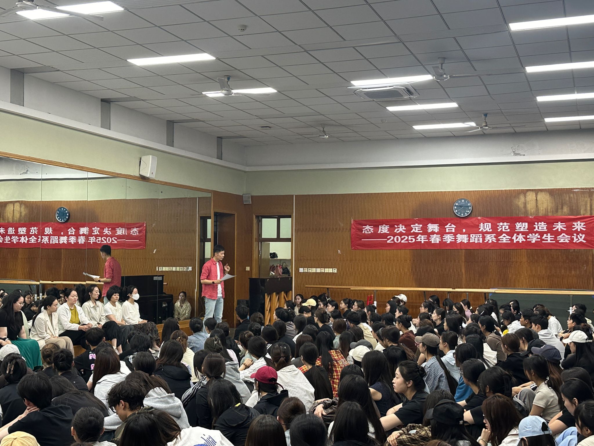舞蹈系主任郑璐副教授担任主讲。他围绕“制度建设、风气引导、平台给予”三大关键词,深入剖析了当前学生在出勤、课堂纪律、专业投入等方面存在的问题,并从“态度”这一根本出发,提出了明确要求。他指出,作为舞蹈专业的每一位学生,首先应树立集体归属感,主动融入学院发展平台,积极承担新葡萄8883官网AMG学生的责任,真正站在“陕师大新葡萄8883官网AMG”的集体名片之上。他强调,舞蹈专业学习不仅关乎技术训练,更需要文化素养的积淀与职业意识的养成。理论课程与专业课程应并重,文化素质是未来教学与创作能力的重要支撑。会上还对学生的日常行为规范作出明确要求。