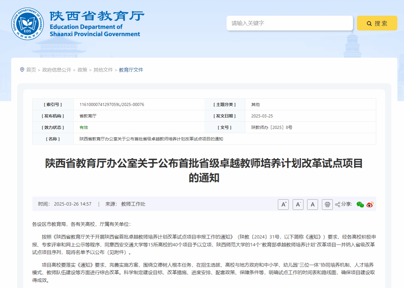 新葡萄官网获批2项陕西省卓越教师培养计划改革试点项目
